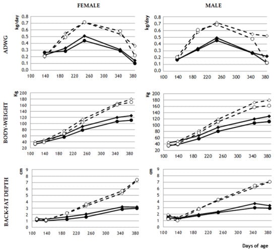 Mean values of average daily weight gain (ADWG; kg/day), body weight (kg) and back-fat depth (cm) in female and male pigs with normal birth weight (NBW; diamond marks) or low birth weight (LBW; circle marks) that were fed a maintenance diet (MD; continuous lines and filled marks) or a fattening diet (FD; discontinuous lines and empty marks). For clarity, SEM is not shown, but can be seen in Supplementary Table S2.