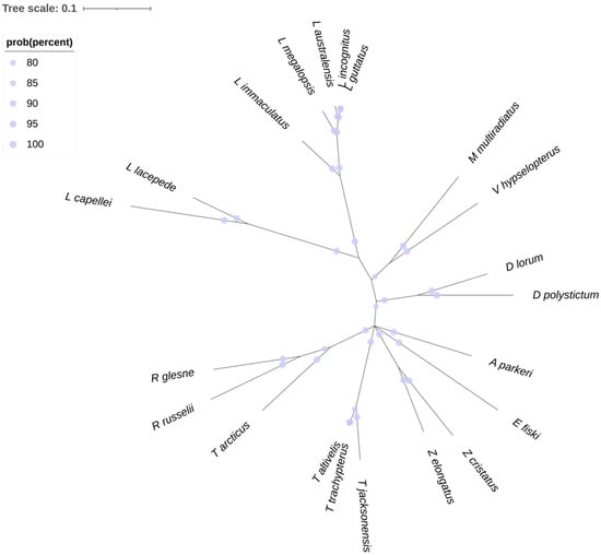 Here, we report the results of the phylogenetic reconstruction of Lampriformes based on the currently available cytochrome oxidase subunit 1 (mt-COI) gene sequences revealed, with high posterior probability support that the topology of the tree is partially in accordance with the currently accepted taxonomic relationships amongst the families (Figure 1). All the coding sequences of mt-COI from 21 Lampriformes species, currently annotated in the GenBank database (Supplementary Materials Table S1), were aligned with MUSCLE and then trimmed with Gblocks. A total of 542 positions were selected for Bayesian phylogenetic reconstruction using the GTR+I nucleotide substitution model. The consensus tree was built after burning 25% of the trees from 500,000 generations. Bayesian posterior probabilities are represented as percentages. This analysis was performed with the pipeline NGPhylogeny.fr [92]. Despite having chosen the most common gene used for phylogenetic analysis in teleosts, there remained six species included in the order (L. guntheri, L. machadoi, R. elongatus, R. kessinger, T. fukuzakii, T. ishikawae) that were without annotated mt-COI sequences, denoting the strong lack of data on the subject, and the need to deepen research in this topic.