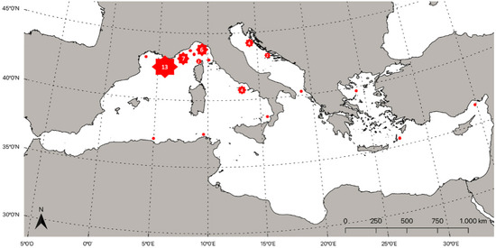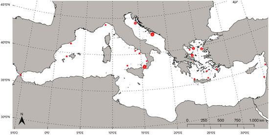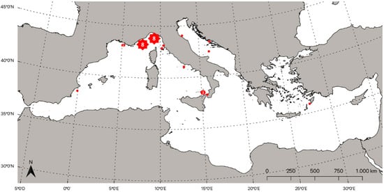 Distributed worldwide in tropical and temperate waters, mainly reported in the North Pacific Ocean [48], and in the Mediterranean Sea, the family Lampridae is represented only by the species L. guttatus, which was anciently reported in the Ligurian Sea by Spinola in 1807 [110], and Risso in 1826 [111] (Table 2). Its occurrence in the North-Wester area of the basin was confirmed by several other authors [112,113,114,115,116]. The presence of this species was successively detected in some other areas of the Mediterranean basin, with an increase in distribution in the last 50 years. In the central part of the basin, the presence of L. guttatus was detected in the southern Tyrrhenian Sea [117,118], and in both the Italian and Albanian parts of the Adriatic basin [119,120,121]. Particularly for the Adriatic Sea, the presence of the species was reported as Lampris luna by Katurić in 1902 [122], and successfully by Cnrković in 1957 [123]. Moving to the eastern Mediterranean Sea, the species was previously detected in the Aegean Greek Sea by Sinis [124]; successively, Corsini-Foka [125] reported the occurrence of a specimen captured by longline fisheries near the surface, off Pigadi in Karpathos Island, the central part of the Aegean Sea. More recently, the species was detected in some new areas, such as in the eastern Mediterranean in Turkey [126], and in the central-eastern part of the basin in Tunis [127]. Francour et al. [128] reported, in 2010, that at least 23 specimens in the western Mediterranean along the French coasts were collected between 1997 and 2009. In the same study, the occurrence of the opah was reported in Gouraya, in northern Algeria. Considering the massive presence of L. guttatus in the area between the Gulf of Lion and the Ligurian Sea, it is probable that the northwestern Mediterranean represents the species’ preferred area in the basin. The estimated distribution of records is shown in Figure 2.