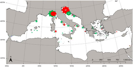 Distribution map of the Lampridae family occurrence in the Mediterranean Sea, in this case, of the unique species reported in the basin, Lampris guttatus. Red stars show the occurrence of a single specimen; the number inside a star refers to the occurrence of the specified number of specimens in the area.