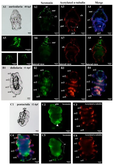 In addition, acetylated α-tubulin staining was observed mainly over the ciliary band, pre-oral loop, and post-oral loop in auricularia. Positive immunoreactions were also identified in the apical ridge and around the anus and pylorus (Figure 2A3,A4,A7,A8 and Figure 3D). With the transformation in morphology, acetylated α-tubulin protein was clearly identified in the ciliary rings in the doliolaria and early pentactula stages (Figure 2B3,B4,C3,C4,C6 and Figure 3E,F). Colocalization of serotonin and acetylated α-tubulin were observed in the ciliary band and anterior apical region in auricularia, and ciliary rings in doliolaria and pentactula (Figure 2A4,A8,B4,C4 and Figure 3E,F).