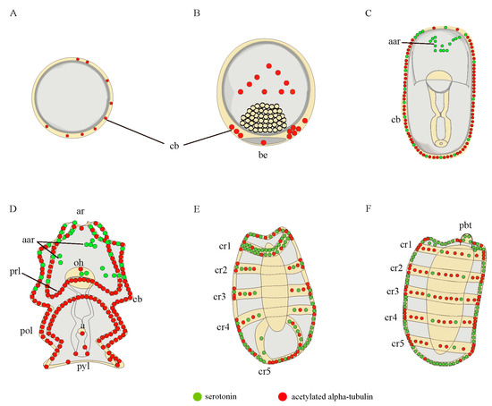 A diagrammatic representation of the nervous system of A. japonicus embryos and larvae stained by serotonin (green) and acetylated α-tubulin (red). (A) blastula; (B) gastrula; (C) late gastrula; (D) auricularia; (E) doliolaria; (F) pentactula. The labels are: a, anus; aar, anterior apical region; ar, apical ridge; be, blastopore; cb, ciliary band; cr, ciliary ring; oh, oral hood; pbt, primary buccal tentacle; pol, posterior loop; prl, preoral loop; pyl, pylorus.