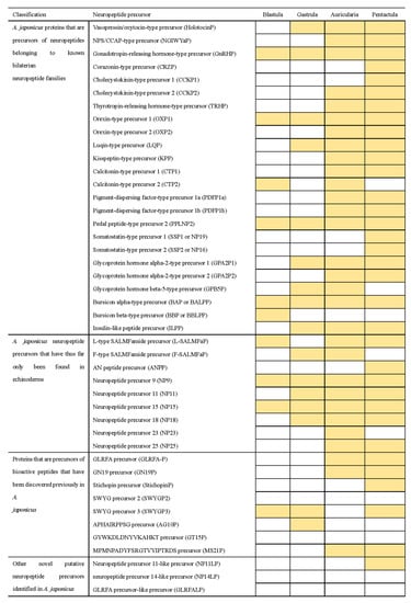 - Chen, M.; Talarovicova, A.; Zheng, Y.; Storey, K.B.; Elphick, M.R. Neuropeptide precursors and neuropeptides in the sea cucumber Apostichopus japonicus: A genomic, transcriptomic and proteomic analysis. Sci. Rep. 2019, 9, 8829. [Google Scholar] [CrossRef] [PubMed]