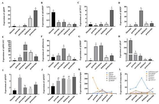 Relative transcriptional level of NP genes in the embryos and larvae of the sea cucumber A. japonicus revealed by quantitative real-time PCR (qRT-PCR). (A) AjKPP; (B) AjGnRHP; (C) AjCTP1/2; (D) AjMS21P; (E) AjPPLNP2; (F) AjHolotocinP; (G) AjTRHP; (H) AjBAP; (I) AjOXP1; (J) AjOXP2; (K) Comprehensive analysis of five NP genes (AjKPP, AjBAP, AjMS21P, AjPPLNP2, AjTRHP) expression; (L) Comprehensive analysis of five NP genes (AjHolotocinP, AjGnRHP, AjOXP1, AjOXP2, AjCTP1/2) expression. Different lowercase letters indicate significant differences between the different stages (p < 0.05).