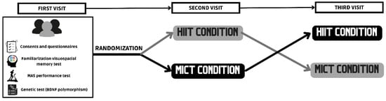 Participants attended the laboratory on three separate occasions. The first visit included the filling in of pre-participation questionnaires and informed consent by the participants, the collection of saliva samples to establish BDNF polymorphism, and a graded exercise test to determine the workload corresponding to the HIIE and MIE. The following two visits to the laboratory were randomized and counterbalanced to carry out the experimental conditions (HIIE or MIE) (Figure 1). For both visits, the participants were required to be present in the laboratory at 9 a.m.