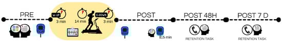 The Visuospatial Memory was assessed before and after each experimental condition. The post-measurement was administered 15 min after the cessation of the exercise. Previous research has identified this time frame as optimal for maximizing the cognitive response to exercise [,]. The Long-Term Formal memory task was performed before each of the experimental conditions (the phase of encoding), thus placing the exercise session itself during the consolidation stage [].