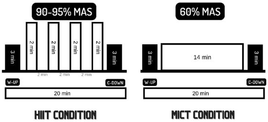 The experimental conditions (HIIE and MIE) were carried out on a treadmill in randomized and counterbalanced order (Figure 1). The sessions were performed one week apart. Both sessions included a 3 min warm-up at 60% MAS. In the case of MIE, this intensity was sustained for the whole duration of the exercise (20 min). The HIIE session consisted of four bouts of 2 min at 90–95% MAS, interspersed with 2 min of passive recovery, and followed by a 3 min cooldown at walking speed to reach a total of 20 min. The volume of both sessions was, thus, standardized. The decision to limit the duration of both sessions to 20 min was founded in the previous research, where a trend towards better cognitive outcomes, in particular, in executive function, was observed in those sessions with similar volumes [,]. Heart rate (HR) was monitored using polar H7 chest straps and the Polar Beat app (Polar Electro Oy, Kempele, Finland) (Figure 3).