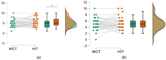 Finally, we have attempted to determine if the differences in the cognitive response observed after HIIE and MIE depended on sex. In this regard, we have not found any discrepancies, and the trend of HIIE being the superior modality was true for both sexes. There are some indications that men release more BDNF both after acute exercise [] and after a period of training [], which could be translated into improved cognitive function. However, there is no agreement in the literature with regard to functional changes, with some studies observing a better cognitive response to aerobic exercise in women [,], while others have found worse long-term outcomes in cognitive function after exercise programs in those studies with a higher percentage of female participants []. This inconsistency could be explained by methodological differences between studies, including the preferential selection of older adults or major variations in the dose/intensity prescription of the chosen exercise type []. Therefore, although we have not found any sex-dependent differences in our case, future research on exercise and cognition should contemplate equivalent samples of both sexes to understand the possible variations between them better.