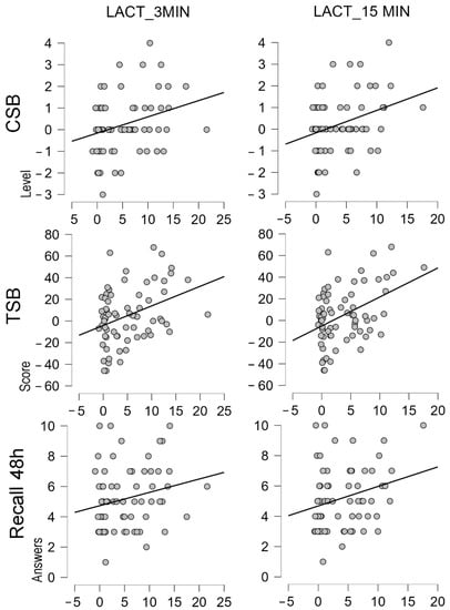 Positive correlations were identified between the changes (Δ) in the LA concentration at 3 min (CSB, r = 0.295, p = 0.013; TSB, r = 0.363, p = 0.002; and Recall 48 h, r = 0.225, p = 0.058) and at 15 min (CSB, r = 0.324, p = 0.006; TSB, r = 0.428, p < 0.001; and Recall 48 h, r = 0.264, p = 0.025) (Figure 6).