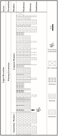 - Wang, D.-M.; Qin, M.; Liu, L.; Liu, L.; Zhou, Y.; Zhang, Y.; Huang, P.; Xue, J.Z.; Zhang, S.H.; Meng, M.C. The Most extensive Devonian fossil forest with small lycopsid trees bearing the earliest stigmarian roots. Curr. Biol. 2019, 29, 2604–2615.e2602. [Google Scholar] [CrossRef]