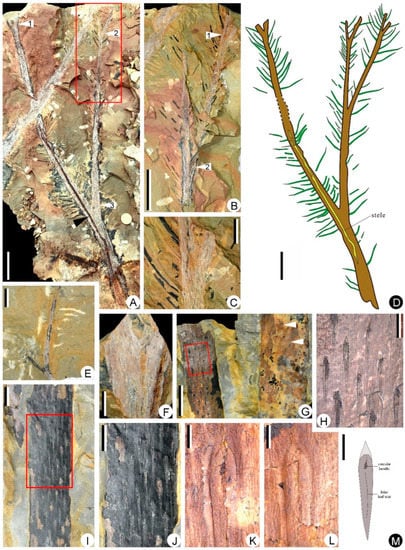 - Meng, M.-C.; Wang, D.-M.; Yao, J.-X. Vegetative characters, growth habit and microsporangiate strobilus of lycopsid Minostrobus chaohuensis. PLoS ONE 2015, 10, e0122167. [Google Scholar] [CrossRef]