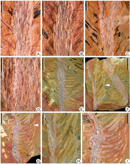 Changxingia longifolia is also reported from the Upper Devonian (Famennian) of South China and is interpreted as a small-sized lycopsid with monosporangiate strobili [10,15]. Its rhomboidal leaf cushions and oblanceolate leaf bases are helically arranged on the stems. Both C. longifolia and Sublepidodendron grabaui produce dichotomized stem and terminal megasporangiate strobili in pairs, while the former bears shorter strobili (20–50 mm in length), and each sporangium contains four Lagenicula-type megaspores.