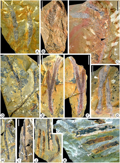 - Taylor, T.N.; Taylor, E.L.; Krings, M. Paleobotany: The Biology and Evolution of Fossil Plants, 2nd ed.; Academic Press: Amsterdam, The Netherlands, 2009. [Google Scholar]