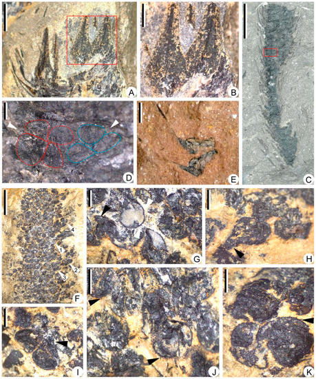 Megasporophylls and megaspores of Sublepidodendron grabaui. (A) Enlargement of portion in Figure 5H (rectangle), showing sporophylls in helices. Scale bar = 2 mm. (B) Enlargement of portion in Figure 6A (rectangle), showing front view of sporophyll laminae, each with a midvein. Scale bar = 1 mm. (C) A partially preserved strobilus. The rectangle indicating the portion enlarged in Figure 6D. Scale bar = 1 cm. PKUB22009. (D) Enlargement of Figure 6C (rectangle), showing contents of a sporangium. The arrows indicating two possible tetrads. The dotted line shows the outline of megaspores in tetrads. (E) Two isolated megasporophyll–sporangium complexes with lateral view of sporophylls. Scale bar = 2 mm. (F) Large numbers of megaspores. Arrows 1–4 indicating portions enlarged in Figure 6G,I–K, respectively. Scale bar = 5 mm. PKUB22013. (G) Enlargement of Figure 6F (arrow 1), showing megaspores with gula and spiny ornamentations. The black and white arrows indicating gula and spiny ornamentation, respectively. Scale bar = 500 μm. (H) A pear-shaped megaspore. The arrows indicating the position of the gula. Scale bar = 500 μm. (I) Enlargement of Figure 6F (arrow 2), showing two megaspores with gula. The arrow indicating the position of the gula. Scale bar = 500 μm. (J,K) Enlargement of Figure 6F (arrows 3 and 4). The arrow indicating the spiny ornamentations on the megaspore surface. Scale bar = 500 μm.