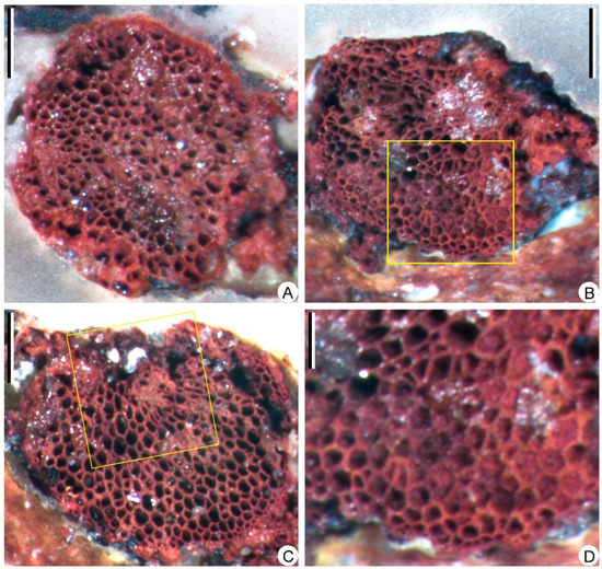 Transverse sections of the stele, showing the anatomy of Sublepidodendron grabaui. (A) Solid protostele. Scale bar = 1 mm. (B) Partially preserved stele. The rectangle indicating the portions enlarged in Figure 7D. Scale bar = 1 mm. (C) Partially preserved stele. The rectangle indicating the portions where tracheids are torn. Scale bar = 1 mm. (D) Enlargement of Figure 7B (rectangle) displaying the periphery of the stele with protoxylem tracheids. Scale bar = 400 μm.