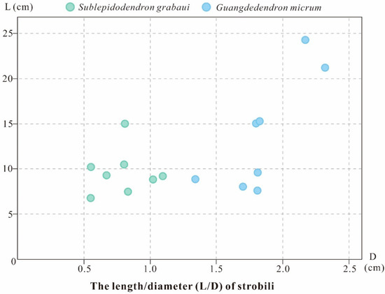 Comparison plot of the dimensions of Sublepidodendron grabaui and Guangdedendron micrum strobili. Data from Wang et al. [27], Gao et al. [14], and this study.