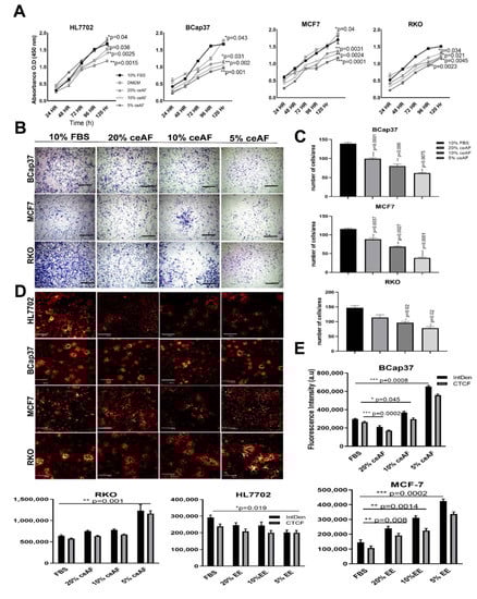 Cells (BCaP37, MCF7, RKO and HL7702) were dispensed 100 μL of cell suspension (5000 cells per well) in a 96-well plate. The plate was pre-incubated for 24 h in a humidified incubator (e.g., at 37 °C, 5% CO2). Different fractions of ceAF (20%, 10%, and 5% v/v) were added into the culture media in plate. The plate was incubated for the following intervals: 12, 24, 48, 72, 96, and 120 h. The CCK-8 (MedChemExpress®, Monmouth Junction, NJ, USA) solution was added, 10 μL, to each well of the plate. The plate was further incubated for three hours. The absorbance at 450 nm was measured using a microplate reader.
