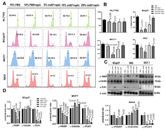 ceAF works agonistically with aphidicolin to arrest tumor cell metastasis. (A) Role of ceAF in suppressing growing tumor cells transition in cell cycle via arresting at G1 phase using aphidicolin. Cells were treated with different fractions, 20, 10, and 5% (v/v) of ceAF, and later treated with a reversible inhibitor of DNA aphidicolin. Flow cytometry measured DNA content by tracing cells’ fluorescence intensity. The percentage of diploid cells is shown on the right side (B), whereas the HL7702 cell line was used as usual. (C) Immunoblots showing significant upregulation of proteins regulating cell cycle and apoptosis (Figures S1–S3). In contrast, β-actin is used as an internal control. Quantification of protein bands was performed by densitometry, and the relative gene/actin ratio is shown in the bottom panel (D). The results shown here are representative of at least three independent experiments. The semi-quantitative analysis of blots is shown were Student’s t-test obtained mean ± SD * p < 0.05 and ** p < 0.01 and *** p < 0.001.
