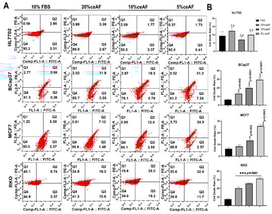 MCF7, BCaP37, RKO, and HL7702 cells were seeded in a 6-well plate with a seeding density of 1 × 106. After starvation and treatment with different fractions of ceAF, cells were synchronized at the G1/S point using aphidicolin blocking []. Briefly exponentially growing cells were treated with aphidicolin (4 μg/mL) for 12 h and, later, washed thrice with PBS. Cells were treated with different fractions (v/v) of ceAF. Cells were detached using trypsin, and sediments were resuspended in a 1 mL hypotonic solution comprising propidium iodide (50 μg/mL) and RNAase solution. Cell cycle distribution was immediately analyzed by flow cytometry (DX-Flex, Beckman Coulter, Fullerton, CA, USA). Cells with less DNA content than G1 cells appeared as dead and apoptotic cells in cell cycle distribution. These cells were further analyzed by FlowJo (Becton, Dickinson, and Company, Franklin Lakes, NJ, USA; 2019) software.