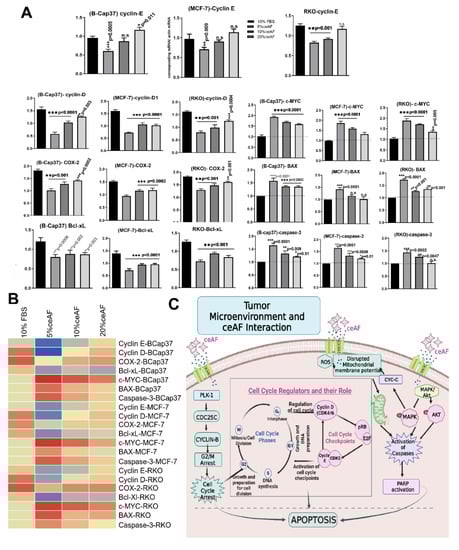 Relative expression of apoptosis regulatory genes was measured by quantitative real-time PCR. Since ceAF has induced apoptosis in the tumor microenvironment, we examined the effect of ceAF on the expression levels of some critical NFκB targeted genes, including cyclin E, Bcl-xL, cyclin D1, and COX-2 on cancer cell lines (the expression levels of these genes were significantly down-regulated). During cell growth and survival, the critical role is played by cyclins D1 and E [,,]. As a result, down-regulation of their expression would certainly shift towards cell cycle arrest in the groups treated with ceAF (Figure 4A). COX-2 inhibition is also co-related to inducing apoptosis []. This result was further supported by regulating anti-apoptotic Bcl-xL gene expression, a negative looped regulator of the effector caspase-3 []. It is also known as a downstream target of NFκB. Similarly, the up-regulation of caspase-3, an enhancer of programmed cell death, further verifies apoptosis in treated cells. A further important up-regulated gene was c-myc, a known regulator of p53 []. C-myc induced p53 which possibly up-regulated the other pro-apoptotic gene BAX gene. The findings above imply the critical role of ceAF, which is essential in inducing apoptosis in tumor cell lines. A comprehensive summary of the relative gene expression of all cell lines is shown in the heatmap (Figure 4B). A possible detailed description of how ceAF contributes to deterring tumorigenesis via cell cycle arrest and disrupting mitochondrial membrane potential is shown in Figure 4C.