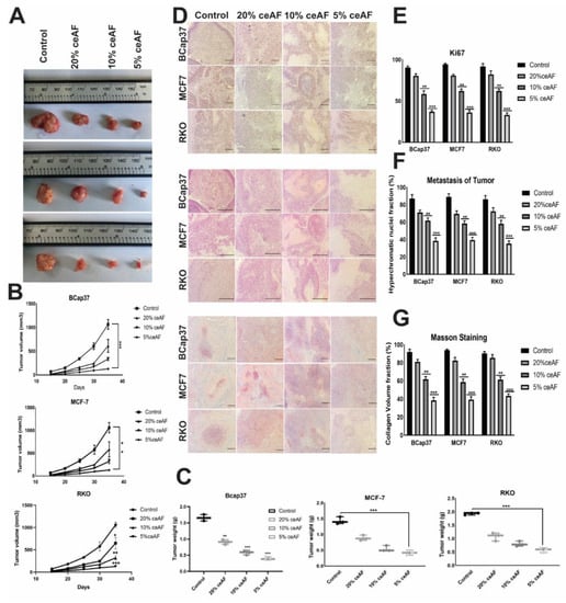 Furthermore, these fluids have low immunogenicity, anti-inflammation, and non-inflammatory features. Several in vivo experiments show that their tumor tropism has opened new horizons for cancer cell therapies []. To support our findings on the positive role of ceAF against tumor recurrence and inhibiting the proliferation of tumor cells, we inoculated the ceAF-treated cells in nude mice and treated the mice with ceAF via subcutaneous injection once the tumor manifested. To our surprise, the 5% ceAF group among all cell lines inhibited tumor growth via suppressing the proliferation and induced apoptosis, as shown in Figure 5B,C; tumor volume and weight are also shown. Furthermore, H&E staining, Masson’s trichrome staining, and Ki-67 staining of xenografts biopsies also show consistent results indicating promising potentials of ceAF against tumor suppression in a dosage-dependent manner.