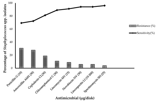 Antimicrobial sensitivity test (AST) of Staphylococcus spp. strains was carried out using the standard Kirby–Bauer disk diffusion method [31]. The following nine antimicrobial agents (μg/disk), commonly used in mastitis treatment, were tested: penicillin G (10), cephalexin CL (30), novobiocin NV (30), lincospectin LI (15-200), amoxicillin AMX (30), ampicillin AMP (30), chloramphenicol C (30), spectinomycin SH (25) and lincomycin MY (15) (Oxoid, Basingstoke, UK). Disk diffusion analysis was performed on Mueller–Hinton agar plates (Oxoid, Basingstoke, UK) with incubation conditions at 37 °C for 24 h. Quality control strains included S. aureus ATCC 33592 and S. aureus ATCC 25923. Inhibitory zone diameters were measured following incubation. The resistance breakpoints were interpreted according to the criteria provided by Clinical and Laboratory Standards Institute (CLSI) documents M100-S28 [32] and VET01S [33].