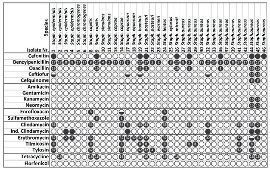 Determination of the antimicrobial resistance magnitude of S. aureus and CoNS strains (VITEK 2 COMPACT system); the black circle (●) indicates antimicrobial resistance and the number within the black circle indicates the magnitude of resistance expressed as the ratio of the MIC of the resistant strains and the MIC of the sensitive strains of the same Staphylococcus species, whereas the empty (o) and the half black circles () are used for susceptible and intermediate strains, respectively.