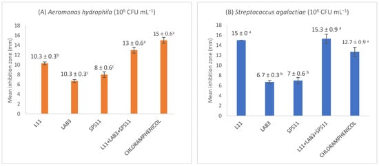 All SSPs and MSPs (109 CFU mL−1) were tested for their ability to inhibit the growth of A. hydrophila, S. agalactiae, V. parahaemolyticus, and V. harveyi at 106 CFU mL−1. Results revealed that B. amyloliquefaciens (L11), E. hirae (LAB3), L. fusiformis (SPS11) inhibited the growth of A. hydrophila and S. agalactiae in the well diffusion assay. Hence, L11, LAB3, and SPS11 were mixed to produce MSP1 and screened in vitro against A. hydrophila and S. agalactiae. In the well diffusion assay, the inhibition zone (13 ± 0.6 mm) shown by MSP1 (L11 + LAB3 + SPS11) against A. hydrophila was significantly higher (p < 0.05) than its constituent SSPs (Figure 1A). The inhibitory zone of MSP1 (15.3 ± 0.9 mm) towards S. agalactiae was significantly higher (p < 0.05) than LAB3 and SPS11, but not L11 (Figure 1B).