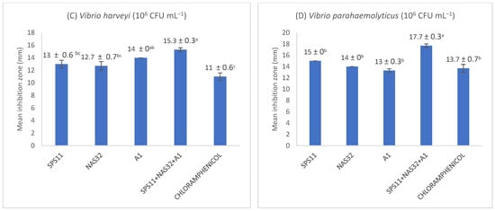 Agar well diffusion assay zone sizes for the inhibition of (A) Aeromonas hydrophila (106 CFU mL−1), (B) Streptococcus agalactiae (106 CFU mL−1), (C) Vibrio harveyi (106 CFU mL−1), and (D) Vibrio parahaemolyticus (106 CFU mL−1) using single- and multi-strain probiotics. L11 = Bacillus amyloliquefaciens; LAB3 = Enterococcus hirae; SPS11 = Lysinibacillus fusiformis; NAS32 = Lysinibacillus sphaericus; A1 = Lysinibacillus fusiformis; MSP1 = L11 + LAB3 + SPS11; MSP2 = SPS11 + NAS32 + A1; Chloramphenicol = Positive control. The values shown are the size of the inhibition zone ± SE (n = 3). Different alphabetical letters (a, b, c, ab, bc) indicate a statistically significant difference (p < 0.05).