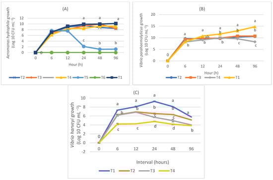 (A) The growth pattern of A. hydrophila incubated with different concentrations of MSP1 L11 + LAB3 + SPS11 (104, 105, 106, 107, and 108 CFU mL−1) against time. T1 (A. hydrophila 106 CFU mL−1), T2 (MSP 104 CFU mL−1 + A. hydrophila 106 CFU mL−1), T3 (MSP1 105 CFU mL−1 + A. hydrophila 106 CFU mL−1), T4 (MSP1 106 CFU mL−1 + A. hydrophila 106 CFU mL−1), T5 (MSP1 107 CFU mL −1+ A. hydrophila 106 CFU mL−1), T6 (MSP1 108 CFU mL−1 + A. hydrophila 106 CFU mL−1); (B) The growth pattern of V. parahaemolyticus incubated with different concentrations of MSP2 SPS11 + NAS32 + A1 (104, 106, and 108 CFU mL−1) against time. T1 (V. parahaemolyticus 106 CFU mL−1), T2 (MSP2 104 CFU mL−1 + V. parahaemolyticus 106 CFU mL−1), T3 (MSP2 106 CFU mL−1 + V. parahaemolyticus 106 CFU mL−1), T4 (MSP2 108 CFU mL−1 + V. parahaemolyticus 106 CFU mL−1); (C) The growth pattern of V. harveyi incubated with different concentrations of MSP2 SPS11 + NAS32 + A1 (104, 106, and 108 CFU mL−1) against time. T1 (V. harveyi 106 CFU mL−1), T2 (MSP2 104 CFU mL−1 + V. harveyi 106 CFU mL−1), T3 (MSP2 106 CFU mL−1 + V. harveyi 106 CFU mL−1), T4 (MSP2 108 CFU mL−1 + V. harveyi 106 CFU mL−1). Different alphabets (a, b, c, ab) indicate significant differences among treatments (p < 0.05).