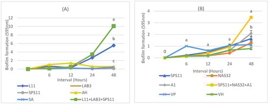 (A) Comparison of biofilm formation for SSPs (L11, LAB3, and SPS11) and MSP1 (L11 + LAB3 + SPS11) with A. hydrophila and S. agalactiae. (B) Comparison of biofilm formation for SSP (SPS11, NAS32, and A1), MSP (SPS11 + NAS32 + A1) with pathogen V. parahaemolyticus and V. harveyi. Biofilm formation was measured at intervals of 6, 12, 24, and 48 h. Different alphabets indicate significant differences among treatments (p < 0.05).