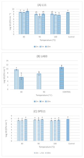 After exposure to different temperatures (80, 90, and 100 °C) for 2, 5, and 10 min, respectively, the three SSP isolates (L11, LAB3, and SPS11), which were the candidate for MSP1, showed the best results. High growth was observed in L11 isolate after exposure to high temperatures (Figure 4) and it was not significantly different (p > 0.05) from the control (isolates without exposure to higher temperatures), except for exposure to 90 °C for 5 min and to 100 °C for 5- and 10-min. High growth was also observed in SPS11 exposed to the various temperatures in comparison to the control. However, no significant differences (p >0.05) were observed among different exposure times to high temperatures. As for LAB3, high growth was observed when exposed to 80 °C for 2 and 5 min as well as those exposed to 90 °C for 2 min. No growth was observed when LAB3 isolated were exposed to 100 °C. NAS32 and A1 were able to withstand high temperature as there was growth observed in all three temperatures across all time intervals.
