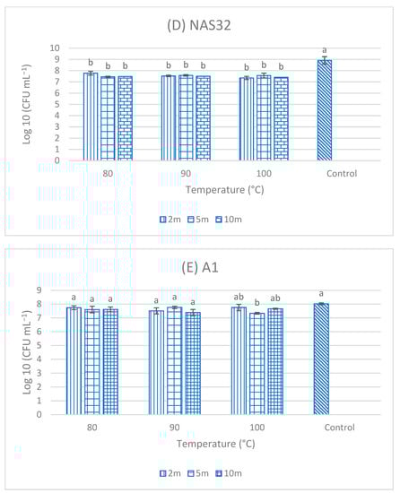 Resistance of (A) L11, Bacillus amyloliquefaciens; (B) LAB3, Enterococcus hirae; (C) SPS11, Lysinibacillus fusiformis; (D) NAS32, Lysinibacillus sphaericus; and (E) A1, Lysinibacillus fusiformis to high temperatures. Values are presented as mean ± SE (n = 3). Significant differences are indicated by different letters (p < 0.05).