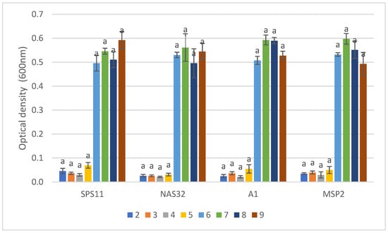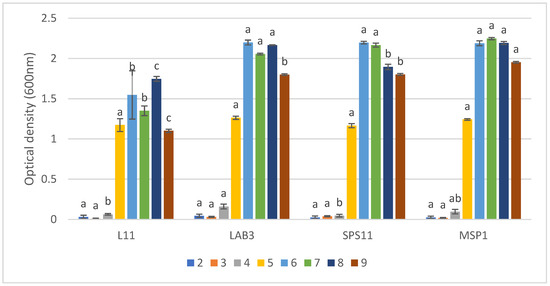 Results showed that the growth (optical density) of MSP1 changed significantly (p < 0.05) from pH 2 to 9. This MSP showed slightly slow growth at pH 2, increased until pH 7, then decreased to pH 9 (Figure 5). The growth of SSPs and MSP1 was not significantly different at pH 2, 3, 4, and 5. The growth of LAB3, SPS11, and MSP1 in pH 6, 7, and 8 was significantly higher than L11. MSP1 showed the highest significant growth in pH 9.