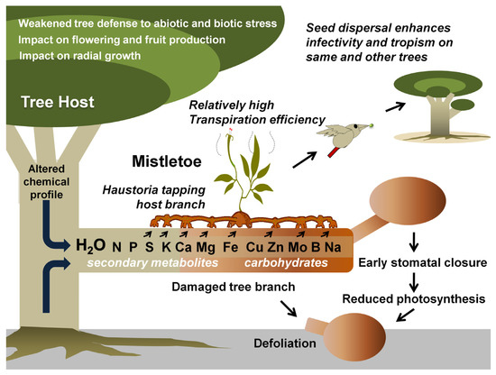 Depending on the parasite’s size, proliferation rate, and photosynthetic potential, as well as the host’s resourcefulness and developmental phase, mistletoe parasites have varying impacts on their hosts [44,46,59,60,61,104,105]. From the first infection, whether mistletoes kill the host or whether other factors offset this mortality is debated [28]. Many studies suggest that mistletoes negatively impact tree survival and fecundity, resulting in changes in population dynamics and structure, which in turn threaten their sustenance and conservation status [98,106,107,108,109]. An infected host (Figure 1) may indicate water stress and depletion of macro- (N, K, Ca, P, and S) [64,110,111,112] and micro-nutrients (Mg, Fe, Cu, Zn, Mo, B, and Na) [113], growth retardation [61,114], morphological and physical abnormalities [62,63,115,116], and shortening of stomatal opening [71]. Upon intensified infection, these effects slowly but eventually lead to the premature death of the host [39,60,117,118]. Besides the above direct damages, changes in the metabolic turnover and water stress (imposed by a competitively higher mistletoe transpiration rate, especially in water-limited scenarios) may render increased tree host susceptibility to microbial pathogens [106,119,120]. Infection with these hemiparasitic plants results in the loss of approximately 22–43% of carbohydrates in hosts [121]. Phoradendron perottetti affects Tapirira guanensis, resulting in the loss of many primary metabolites (especially soluble carbohydrates) and secondary metabolites (high levels of flavonoids) at the galls [53,61]. This is indicative of reactive oxygen species (ROS) quenching [53,61]. Further, a reduction in chlorophyll, foliage, and the biomass of hosts may reduce the photosynthetic potential as well as host biomass [52,58,59,62,122,123,124,125]. The radial growth of tree hosts has been reduced by Viscum spp. in Germany, Switzerland, and Spain [111,123,126], as evident from the reduction in annual growth rings in trees [125,127]. Moreover, mistletoe can interfere with flowering and fruiting and make the hosts more vulnerable to insect and fungal damage [128,129]. They also compete with host chemical profiles to remain healthy [130,131]. Lázaro-González and coworkers showed that Viscum album may load-dependently reduce the nitrogen concentrations in its pine hosts and may effectuate defense signals resembling drought, burning, and defoliation [130]. Recent work with Phoradendron crassifolium and Psittacanthus robustus revealed that tree branches neighboring the mistletoe infection site relatively experienced more adversities [132]. Studies have also reported a 40% reduction in mycorrhizal richness in tree hosts during mistletoe infestation [133,134]. In terms of foliar appearance, mistletoes often mimic their hosts [135,136,137]. This prevents them from being recognized by predators and herbivores that feed on them [135,136,137,138,139]. The exploitation of secondary metabolites from the host is known to confer such properties [135,136,137,140]. By doing so, mistletoe bypasses natural removal from hosts and escapes pruning or pollarding practices. The mimicry hypothesis in the case of Australian mistletoes, however, was questioned in a study by Blick and coworkers [141].