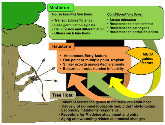 Resource-tapping possibilities from genetic pools to strategize transgenic host resistance to mistletoes. The gap in functional genomics studies on mistletoe parasitism has majorly limited the exogenous induction and/or introduction of mistletoe resistance in hosts. This would require, in principle, the characterization of genetic targets in mistletoe and tree hosts that signal and favor easy entry to mistletoes (shown here) and then testing of the conventional gene manipulation and transgenics’ frameworks (see Figure 5). Even putative MBCAs can be screened for genetic elements encoding factors detrimental to mistletoe parasitism and/or its life cycle.