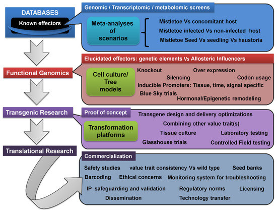 Generalized transgenic and translational research pipeline for developing and disseminating stable mistletoe-resistant tree hosts of commercial value(s). Genetic elements (or their homologs) putatively conferring mistletoe resistance may be recovered from relevant repositories such as the NCBI’s GenBank and KEGG, and also may be screened using systems biology and bioinformatics tools, following genomic, transcriptomic, and metabolomic analyses. Some suggestions are depicted in Figure 4. Precisely, such meta-analyses can be performed on various pairs of genetic/expression pools. Once the genetic elements directly encoding the resistance trait or indirectly influencing the parasitism are stipulated, they may be tested on various grounds in small-scale assays and observations, in order to plan the appropriate design of the transgenic framework. In this way, cell and tissue culture models of parasitism involving trees and mistletoes may be indispensable and may generate proof(s) of concept(s). Then, a focused transgenic gene manipulation and characterization stage would involve lab-to-field-scale testing and validation of the successfully developed events. Translational activities would follow commercialization requisites on a case-by-case basis.