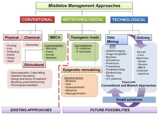 Scheme of existing mistletoe management options and future possibilities with biotechnology and technologically smart approaches. Transgenic interventions and the use of technological advancements may solve the present problems in mistletoe management. An epigenetic remodeling strategy, however, would be a far-future possibility and might be realized following a full understanding of the basis of the multitrophic interactions prevailing in the vicinity or within mistletoe–tree host associations.