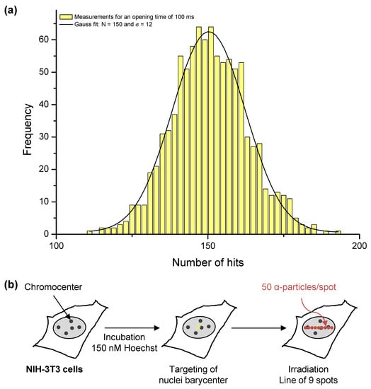 We irradiated cells with a mean number of ions, controlled by the definition of an opening time of the microbeam on each target, as described previously [21]. To monitor the beam and thus define this opening time, we used a PIPS detector (PD50-12-100AM, Mirion Technologies (Canberra) S.A.S., Montigny-Le-Bretonneux, France), located on the microscope objective wheel. This detector can easily be placed in the beam trajectory, but can only be used without any living sample, because of the limited range of ions available on MIRCOM inside the samples. It is used as a reference detector to monitor the counting rate of the ion beam. An automatic procedure allows the multiplication of single measurements to ensure a reliable result. An example of the measurements carried out during the experimental campaigns, for an opening time of 100 ms, is shown in Figure 1a. In this particular case, we obtained a mean number of ions N = 150, with a standard deviation σ = 12. This result is compatible with a Poisson law, where σ = √N. To ensure that the beam did not undergo major fluctuations during the irradiation, we measured the mean counting rate between each sample. We observed no significant variation of the beam between two consecutive controls.