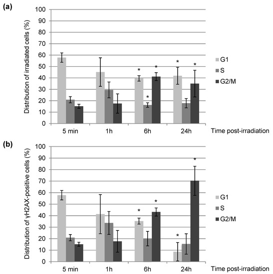 Cell cycle distribution of NIH-3T3 cells upon irradiation with α-particles. We irradiated NIH-3T3 cell nuclei with α-particles distributed in a dotted line, as shown in Figure 1b. At the indicated times after irradiation, we permeabilized cells with CSK + Triton X-100 to remove soluble nuclear components and fixed them. We subsequently performed immunostaining of γH2AX and DNA staining with DAPI. We monitored the cell cycle status (a) of irradiated cells and (b) of γH2AX-positive cells among irradiated cells by immunofluorescence. Each value shown represents the mean of at least three independent irradiations. For each value, we analyzed in total between 80 and 800 cells. The error bars represent the standard error, and the p values are indicated (* p < 0.05).