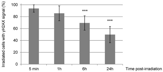 Percentage of γH2AX-positive NIH-3T3 cells upon irradiation with α-particles. We quantified the number of NIH-3T3 cells from samples used previously in Figure 2 carrying γH2AX signal among the total irradiated cells at the indicated times after α-particle irradiation. Each value shown represents the mean of at least three independent irradiations. The error bars represent the standard error, and the p values are indicated (*** p < 0.001).