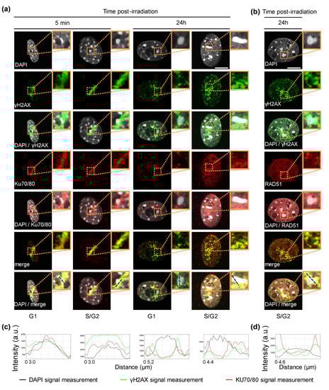 Firstly, 5 min after irradiation, almost 100% of irradiated cells exhibit clear γH2AX staining (Figure 3) along a signal shape that is consistent with the irradiation pattern (Figure 1b and Figure 4a,b). Next, we evaluated the localization of KU70/80 dimer or RAD51 protein at irradiated sites, on which unsurprisingly γH2AX is detected. We observed the recruitment of KU70/80 dimers at the damage sites shortly (5 min) after irradiation in all cells (Figure 4a,c, 5 min). In contrast, although around 35% of irradiated NIH-3T3 cells are in S or G2 phase (Figure 2a), a period when HR-mediated repair is active, the recruitment of RAD51 at irradiated sites is not observed in any of the cells 5 min upon localized irradiation (Figure 4b,c, 5 min). These data suggest a faster recruitment of NHEJ proteins on damaged DNA in comparison to HR proteins following an irradiation with α-particles.