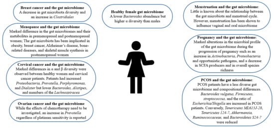 An increasing body of research highlights the importance of gender differences in the epidemiology, pathophysiology, and treatment of various diseases, especially non-communicable diseases [1]. Furthermore, females are at a greater risk of suffering from osteoarthritis, heart disease, urinary tract problems, stroke, depression, and anxiety [2]. However, although females comprise almost half of the human population, there is a reported discrepancy in the presentation of the genders in health studies [3]. Moreover, women are underrepresented, and their physical complaints are trivialized [4,5]. Hence, many organizations call upon the inclusion of gender as a dimension in clinical trials [1]. Aside from obvious physical differences, the two genders are reported to have compositional differences in their gut microbiome [6]. Namely, a study employing 348 male and 341 female mice from 89 matched strains reported marked abundance differences among several taxa between the sexes, and a larger number of differences were observed at the single strain level [7]. A bidirectional relationship is established between host hormones and the host’s gut microbiome. Moreover, sex hormones can affect bacterial growth and virulence. Namely, the sex hormones estriol and estradiol inhibit bacterial virulence through hindering quorum sensing while progesterone was shown to enhance the growth of oral Bacteroides species and Prevotella intermedius [8]. Interestingly, some studies also imply that commensal microbiota can influence and modulate sex hormone levels [7]. While we still cannot define what a healthy gut microbiome is, gut microbial dysbiosis has been correlated with various diseases ranging from irritable bowel syndrome to cancer [9,10,11,12]. In light of the reported associations between the gut microbiome and overall human health, coupled with the disproportionately higher risk females are under for various diseases, the female gut microbiome is a topic worthy of investigation. Using PubMed as a database, we searched the literature using key terms, namely “gut microbiome”, “estrogen”, “menopause”, “polycystic ovarian syndrome”, “pregnancy”, and “menstruation” and a time interval ranging from 2012 to 2022 with a focus on recent studies. Herein, we review and describe the composition of the healthy female gut microbiome, the potential role of the gut microbiota and its dysbiosis in female diseases such as polycystic ovaries syndrome (PCOS) and female cancers, and otherwise, normal female physiology, namely, pregnancy, menstruation, and menopause, and finally the importance of the gut microbiota in postmenopausal health and postmenopausal illnesses.