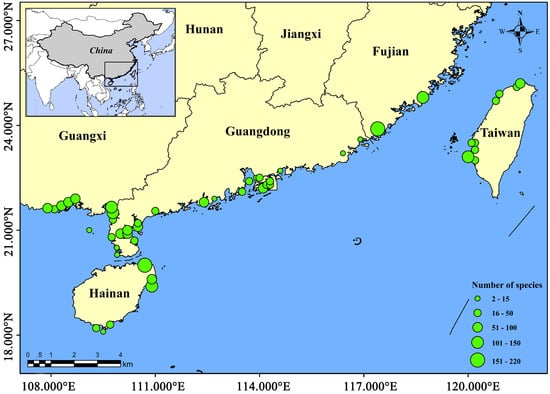 The study area comprised documented Chinese mangrove areas. The currently known distribution locations of Chinese mangrove fish ranged from the southernmost Qingmei Port to the northernmost Tanshui River, with a total of 54 mangrove areas (Table 1, Figure 1). The provinces or administrative regions involved included Guangdong, Guangxi, Hainan, Fujian, Hong Kong, Taiwan, and Macau. To achieve general representativeness of the data and analysis accuracy, we divided the 54 mangrove areas into 16 regions by geographic location, and the areas with less survey data were excluded. These areas experience a subtropical and tropical marine monsoon climate with an annual average temperature of 21–25 °C []. The tides tend to vary, with regular semi-diurnal tides in Fujian, irregular semi-diurnal tides in Guangdong, regular diurnal tides in Guangxi, and irregular semi-diurnal tides and irregular diurnal tides in Hainan and Taiwan. Water salinity shows considerable variation owing to changes in rainfall and river runoff, and it is higher in summer and lower in winter, ranging from 0.7 to 34.4‰ [,].
