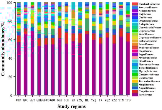 Relative abundance of fish community composition at the order levels across different mangrove regions. CHN: CHINA; QWC: Wenchang, Hainan; QSY: Sanya, Hainan; QHK: Haikou, Hainan; GFCG: Fangchenggang, Guangxi; GDX: Dongxing, Guangxi; GQZ: Qinzhou, Guangxi; GBH: Beihai, Guangxi; YD: Eastern Guangdong; YZSJ: Pearl River Delta; HK: Hong Kong; YX: Western Guangdong; YZJ: Zhanjiang, Guangdong; MQZ: Quanzhou, Fujian; MZZ: Zhangzhou, Fujian; TTN: Tainan, Taiwan; TTB: Taipei, Taiwan.