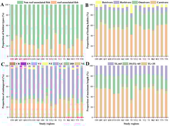 Distribution characteristics of fish community structure in different regions. (A) Habitat types of fishes in different regions. (B) Feeding habits of fishes in different regions. (C) Endangered of fishes in different regions. (D) Maximum length of fishes in different regions. CHN: CHINA; QWC: Wenchang, Hainan; QSY: Sanya, Hainan; QHK: Haikou, Hainan; GFCG: Fangchenggang, Guangxi; GDX: Dongxing, Guangxi; GQZ: Qinzhou, Guangxi; GBH: Beihai, Guangxi; YD: Eastern Guangdong; YZSJ: Pearl River Delta; HK: Hong Kong; YX: Western Guangdong; YZJ: Zhanjiang, Guangdong; MQZ: Quanzhou, Fujian; MZZ: Zhangzhou, Fujian; TTN: Tainan, Taiwan; TTB: Taipei, Taiwan.