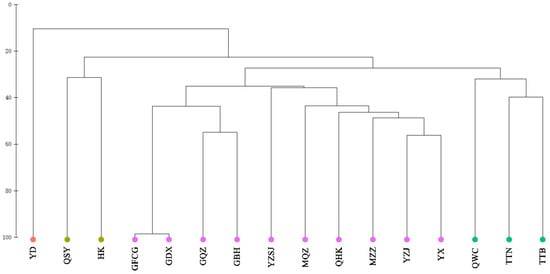 Cluster diagram of fish community structure in mangrove of China. YD: Eastern Guangdong; QSY: Sanya, Hainan; HK: Hong Kong; GFCG: Fangchenggang, Guangxi; GDX: Dongxing, Guangxi; GQZ: Qinzhou, Guangxi; GBH: Beihai, Guangxi; YZSJ: Pearl River Delta; MQZ: Quanzhou, Fujian; QHK: Haikou, Hainan; MZZ: Zhangzhou, Fujian; YZJ: Zhanjiang, Guangdong; YX: Western Guangdong; QWC: Wenchang, Hainan; TTN: Tainan, Taiwan; TTB: Taipei, Taiwan.