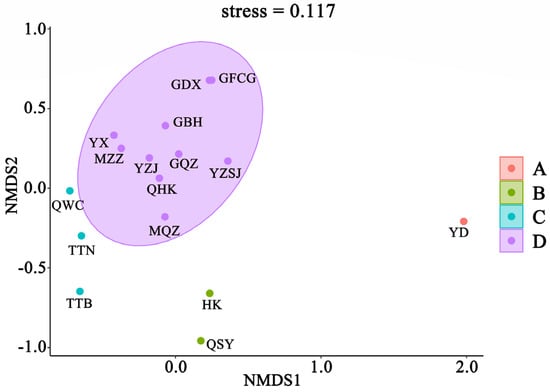 Cluster analysis of fish communities in Chinese mangroves showed that at a similarity level of 30%, 16 mangrove regions were divided into 4 groups; Eastern Guangdong only was assigned to group A; Sanya, Hainan, and Hong Kong were assigned to group B; Wenchang, Hainan, Taipei, Taiwan, and Tainan, Taiwan were assigned to group C; Quanzhou, Fujian, Haikou, Hainan, Western Guangdong, Zhanjiang, Guangdong, Zhangzhou, Fujian, Pearl River Delta, Fangchenggang, Guangxi, Dongxing, Guangxi, Qinzhou, Guangxi, and Beihai, Guangxi were assigned to group D (Figure 4). The results of the NMDS analysis (Figure 5) also supported the clustering (stress = 0.117 < 0.2). The SIMPER similarity percentage reflects the intra-group similarity and inter-group dissimilarity, as well as key species with larger contribution rates. As group A comprised only one region, SIMPER intragroup similarity analysis was performed only on groups B, C, and D. The results of intra-group similarity showed that the intra-group similarity of group B was 31.37%, and the highest contribution rate of Periophthalmus modestus was 93.75%; the similarity within group C was 34.54%, of which Acentrogobius caninus had the highest contribution rate of 90.15%; the similarity within group D was 40.30%, among which Megalops cyprinoides had the highest contribution rate of 90.13%. The results of the SIMPER between groups show that, except for the lower degree of dissimilarity between groups C and D (72.71%), dissimilarity between groups generally exceeded 75% (Table 2). The ANOSIM test results were comparable, with a Global R range of 0–1 (the closer R is to 1, the greater the difference). The R value between groups C and D was 0.71, whereas that between the other groups were larger, indicating significant differences between the four groups (Table 2).