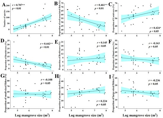 The total number of fish species was positively correlated with the size of mangrove size (r = 0.71, p < 0.01) (Figure 6A), while the proportion of reef fish showed a significant negative correlation with mangrove size (r = −0.46, p < 0.01) (Figure 6B). Further detailed analyses of the fish community results showed that the size of mangroves was also correlated with fish feeding habits and was significantly positively correlated with the proportion of carnivorous fish (r = 0.42, p < 0.05) (Figure 6C). The proportion of omnivores was negatively correlated (r = −0.44, p < 0.01) (Figure 6D). The correlations of mangrove size with the proportion of herbivores and that of detritivores were not significant (r = 0.15 and r = −0.16, respectively) (Figure 6E,F). With the increase of mangrove size, the proportion of fish size changed, and the proportion of small-sized fish and large-sized fish showed a decreasing, yet non-significant, trend (r = −0.10 and r = −0.24, respectively) (Figure 6G,I), while there was an increasing, yet non-significant, trend in medium-sized fish (r = 0.22) (Figure 6H).