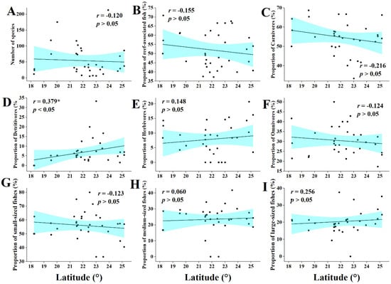 Relationship between mangrove latitude and characteristics of fish communities. (A) The relationship between number of fish species and the mangrove latitude. (B) The relationship between reef-associated fish and the mangrove latitude. (C) The relationship between carnivores and the mangrove latitude. (D) The relationship between detritivores and the mangrove latitude. (E) The relationship between herbivores and the mangrove latitude. (F) The relationship between omnivores and the mangrove latitude. (G) The relationship between small-sized fishes and the mangrove latitude. (H) The relationship between medium-sized fishes and the mangrove latitude. (I) The relationship between large-sized fishes and the mangrove latitude. (*: Significant, p < 0.05).